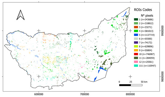 A false-colour image (FCI) was generated starting from mosaicked S2 bands, including B8, B4 and B3 in the channels of Red, Green and Blue respectively. Thirteen FCI classes were defined by searching for a specific land cover class, according to Appendix A, Table A1. Subsequently, 5491 regions of interest (ROIs) were randomly selected and photo-interpreted according to FCI classes. Figure 6 shows the ROIs’ locations. The total area of the ROIs corresponded to 1.6% of the entire surface of the GD. Table 4 reports the land cover classes adopted and the relative codes.