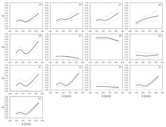 ROIs’ spectral signatures. Bold line represents the mean value; dotted lines are mean value ± 1 standard deviation. (a) Dense Forest-1; (b) Sparse Forest-111; (c) Open Forest-2; (d) Bare Soil/Urban-3; (e) Grassland and lower vegetation-4; (f) Water-5; (g) Clouds-6; (h) Cloud Shadows-7; (i) Lower vegetation with strong vigour-8; (j) Agronomical field-9; (k) Wetlands and burned areas-10; (l) Fragmented croplands-11; (m) Croplands-12.