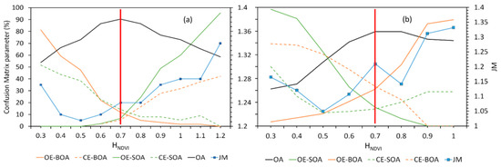 Accuracy parameters used to select the NDVI entropy threshold (HNDVI, red vertical line) to generate a binary classification of rural production systems. (a) Agriculture LULC accuracy. (b) Pasture LULC accuracy. Omission and Commission Errors (OE and CE) produced during Business Oriented Agriculture systems classification (OE-BOA and CE-BOA) are marked by solid and dotted orange lines, respectively. Omission and Commission Errors generated during Subsistence Oriented Agriculture systems classification (OE-SOA and CE-SOA) are marked by solid and dotted green lines. The overall accuracy (OA) is represented by solid black lines and the Jeffries–Matusita (JM) values are depicted by blue lines.