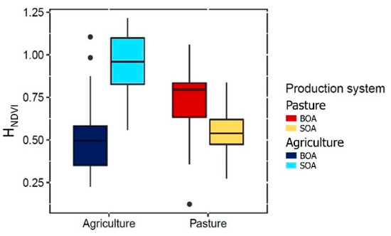 It is worth remembering that an interpretation of HNDVI behaviour is needed to determine the meaning of classes. This interpretation was achieved by looking for HNDVI class distributions (Figure 10). High entropy in the agriculture class denoted strong spectral variability within each patch, probably related to bare soil/vegetation alternation typical of SOA; inversely, in the BOA a low variability index of vegetation was expected due to homogeneous management of the surface. Conversely, for the pasture class the meaning of entropy changed; in fact, in a pasture system the rate use of vegetation follows grazing pressure [78,79]. High grazing pressure generates a homogeneous consumption of pasture, thus a low HNDVI value within each patch. SOA is characterised by small grazing surfaces and intensive local use of pastoral resources. Ordinarily, a BOA pasture system has large surfaces (low grazing pressure) [80], which results in heterogeneous consumption of pasture and increasing HNDVI values.
