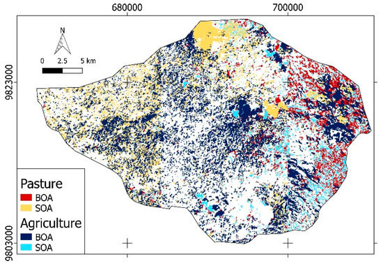 With this interpretative key, a final production systems map (Figure 11) was generated as follows: in the agriculture class, all patches with average HNDVI ≥ 0.7 were classified as SOA, while patches with HNDVI < 0.7 were classified as BOA. In the pasture class, the same principle was applied in inverse.