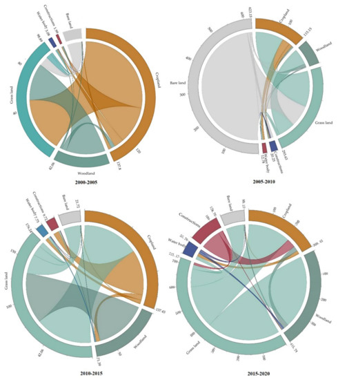 To fully understand the structural characteristics of land-use changes in the Hung River Valley during this period, a land-use transfer matrix was constructed to calculate the number of mutual land-use transfers from 2000 to 2020 (Table 3). As shown in the table, from 2000 to 2005, land-use shifts mainly occurred between arable land, grassland, and forest land, with a larger amount of arable land shifting to grassland and construction land. During the period 2010–2015, the trend of the previous period continued, with arable land always being the source of inflow of construction land and grassland, while the inflow and outflow of grassland and forest land were basically the same. From 2015 to 2020, the interconversion of various land uses made the inflow and outflow basically the same.