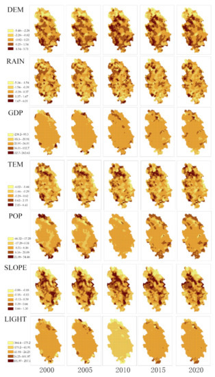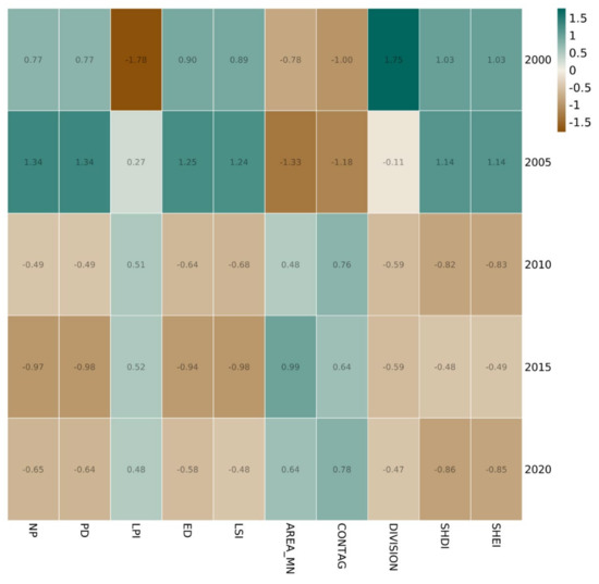 Since the magnitudes of different indicators are different, to facilitate comparison, the sampling of Z is standardized, as are all landscape pattern index values. As can be seen in Figure 3, NP and PD showed an increasing trend between 2000 and 2005, which is related to the partial conversion of arable land in the study area into forest land and grassland, and a large amount of arable land outflow, causing arable land fragmentation. After 2005, PD and NP gradually decreased, combined with the actual situation of the Hung River Valley. It can be seen that urban construction land encroachment on arable land, where there are many construction enclaves, merged with the original construction land, the main reason for the decline in PD and NP, in addition to the demolition and merging of rural settlements. LPI and AREA_MN increased slightly between 2000 and 2005 and fluctuated little after 2005, while DIVISION decreased slightly, indicating that the overall landscape pattern of the Hung River Valley showed a clustering trend after 2005.
