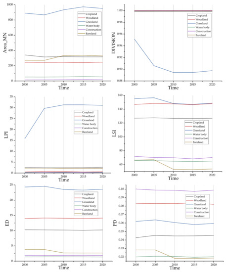 Changes in habitat quality are an indirect reflection of changes in different land types. To reveal in more detail the relationship between landscape changes in the study area and their impact on habitat quality, the characteristics of changes in different land types between 2000 and 2020 were calculated using Fragstats 4.2 (Figure 4). Grassland and woodland are important landscapes regarding the quality of habitat, with a decrease in the number of patches (NP), a decrease in density (PD), an increase in the mean patch area (AREA_MN), and a decrease in ED, LSI, and DIVISION from 2005–2020, indicating an overall clustering of landscape patterns and an increase in disturbance resistance in grassland. It is particularly important to note that the patches of built-up land in the study area decreased, and density decreased over the 20-year period, but ED increased slightly, and LSI and DIVISION remained largely unchanged, indicating that the landscape pattern in some areas became dispersed, which may be related to the extensive expansion of towns in Xining.