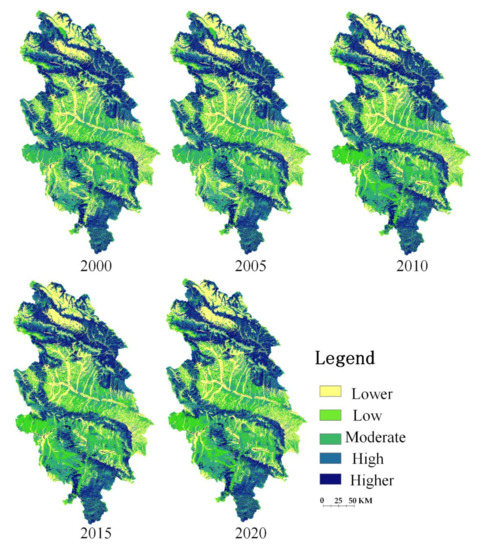 From 2000 to 2020, the overall habitat quality showed an upward trend, and the global average habitat indexes were 0.656, 0.657, 0.661, 0.661, and 0.662, respectively. The main reason for this is that around 2000, Qinghai Province, based on its development orientation, successively carried out a series of ecological protection and restoration work, e.g., returning farmland to forest, returning farmland to grassland, and constructing nature reserves, which promoted the transformation of some medium- and high-grade habitat patches to higher-grade habitat patches.
