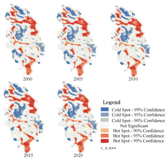 The global spatial autocorrelation can only reflect whether there are agglomerative features in the study area as a whole and cannot clarify the location distribution of agglomerative features. Based on the ArcGIS 10.6 platform, a hotspot analysis was conducted based on a grid, and cold spots and hotspots with a confidence level above 90% were selected to reflect the distribution of high- and low-value habitat quality clusters in the Hung River Valley (Figure 6).