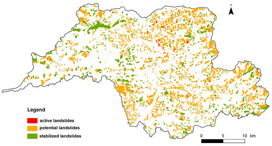 There are 1869 landslides registered in this area. Landslides are registered in the State Geological Institute of Dionýz Štúr databases and their locations were verified in the field. The database contains point landslides (those of small proportion) and area-wide landslides. The Atlas of slope stability maps SR [57] is the basis for digital layers that are continuously updated. Landslides take up almost 20% ( ) of the monitored area and the majority, 62%, occurred mainly due to climatic factors associated with erosion (lateral and deep) and abrasion. According to the activity, the landslides were divided into three categories: active, potential and stabilised (Figure 2). An active (live) landslide is a landslide in motion. If the motion is currently being suspended, but the causes of its formation can appear under suitable conditions, then the landslide is considered potential (temporarily suspended). In stabilised (permanently suspended—non-active) landslide the causes for its occurrence are no longer present, or they have been removed by human intervention. The majority of the landslides present in the study area, 70%, were classified as potential landslides, with a total of 1284 ( ). Stabilised landslides follow with 544 ( ), and then 41 active landslides ( ). For the purposes of the predictive modelling of landslide susceptibility the active and potential landslides were grouped together to form the landslide category and the stabilised landslides were assigned to the non-landslide category together with the landslide-free areas (see Figure 3p for the map of landslides as used during the modelling).