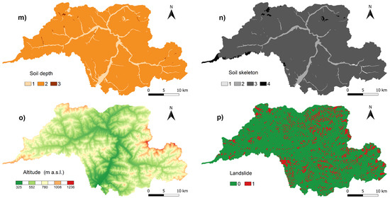 - Altitude (Alt) (Figure 3o)—continuous variable (from 325 m a.s.l. to 1236 m a.s.l.). It is a grid representation of the DTM with resolution 20 × 20 m that represents continuous variables of the height fields and respects the course of the current river network.