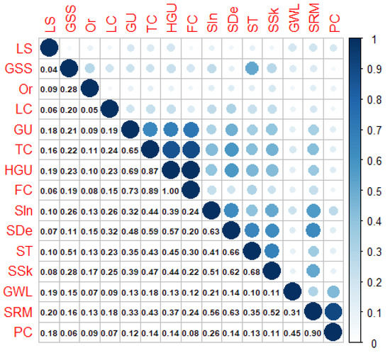 Matrix of Cramer’s V. Three groups of highly correlated variables are present. Group 1: GU, TC, HGU, and FC; Group 2: SIn, SDe, ST, and SSk; and Group 3: SRM and PC. The variables are ordered according to the results of the agglomerative hierarchical clustering method.