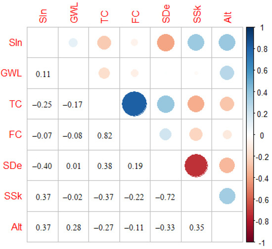A common feature of the real-world data is that the input variables (also called predictors) are not independent from each other. This may result in unstable estimates of the parameters which prevent identifying the variables relevant to modelling landslide susceptibility and interpreting their effects [70]. Therefore, the next step was to perform the correlation analysis for the input variables to determine the relation between them. The manner of measuring the association varies based on the type of variables (continuous, categorical ordinal, or categorical nominal).