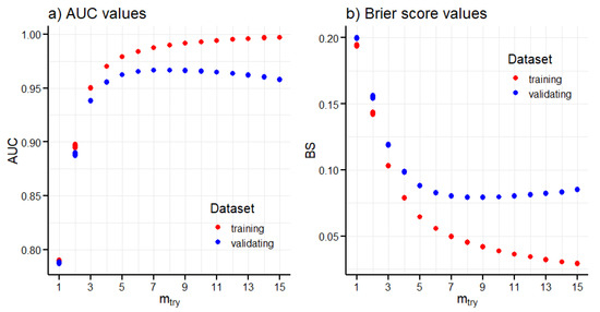 During the training process each decision tree in the random forest is trained on the random portion of the whole training data set and at each node a subset of variables randomly selected from all input variables is considered in creating a criterion used to split the data in that node. This is done in order to reduce the correlation between decision trees in the forest and so decrease the error rate. The class assigned in each end node is determined as the class of the majority of the training data in the end node. For the training of random forests two hyperparameters need to be selected: number of trees in the forest , and number of input variables considered in creating a splitting criterion in each node . These variables are randomly chosen from all input variables available to the random forest and are chosen for each node separately. It has been shown in [75] that higher values of increase both the correlation between the trees and the classification accuracy of individual trees. Therefore, multiple values of need to be considered during the training. According to the authors of [71], increasing has a positive effect on the performance of the model; however, empirical studies performed in [76,77] show that for most of the examined datasets random forest performance does not substantially improve after the first 100 and 64 or 128 trees, respectively, were trained. Therefore, the number of trees in the random forest model used in this study was set to . The number of variables considered for splitting in a node was selected to optimise the model performance.