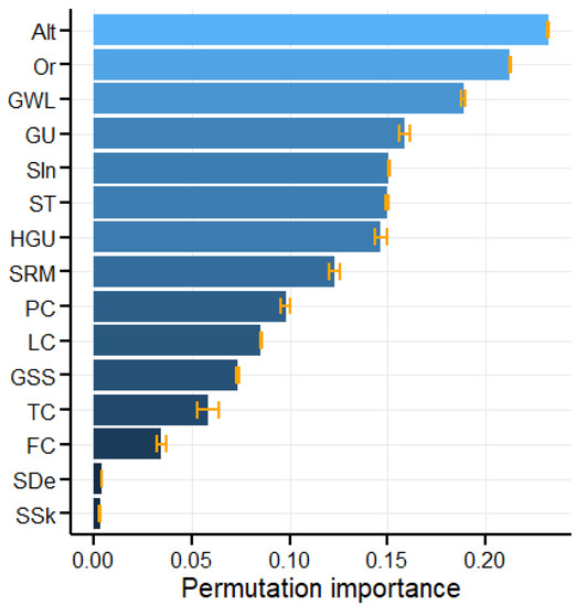 The random forests method also allows us to evaluate the importance of predictor variables in relation to the performed task. Two variable importance measures most commonly used are Gini importance [75] and permutation importance [80]. For variable X, the Gini importance takes the accumulated improvement in the splitting criterion over all nodes and trees where the variable X is used for splitting as its importance. The permutation importance is computed as the decrease in the performance of the model when the values of the variable are randomly permuted. In this study the permutation importance is used.