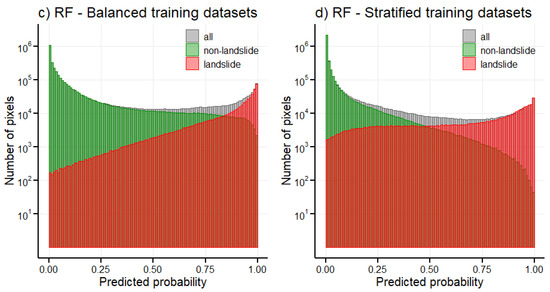 The usual practice in landslide susceptibility modelling is to train models on the balanced dataset, i.e., on a dataset containing the same number of landslide and non-landslide pixels. To achieve such training datasets during the cross-validation, landslide pixels were divided into 5 subsets and an equal number of non-landslide pixels was added to each subset. However, since landslides occur only rarely in nature, we also performed cross-validation with the stratified subsets, i.e., the ratio of landslide and non-landslide pixels in the subset was the same as the ratio in the whole dataset. The validation dataset for both types of training datasets was always stratified to simulate the frequency of landslide occurrence in nature.