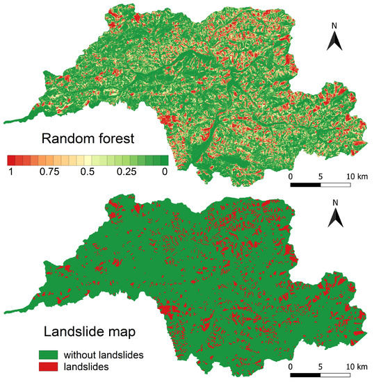 Since we are also interested in the probability of landslide occurrence, we use the random forest method described in [79]. To estimate the probability, first the proportion of landslide pixels in the end node is determined for each tree. Then, the individual estimates are averaged to calculate the final estimate.