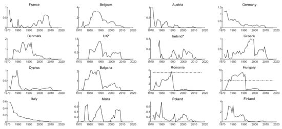 Annual data on the EFP per capita (global hectares per capita) for the EU countries were obtained from the Global Footprint Network (http://data.footprintnetwork.org, accessed on 10 November 2021), spanning the period 1962–2017. The time period was consistent with data availability for Austria, Belgium, Sweden, France, Netherlands, Poland, Greece, Finland, Denmark, Italy, Ireland, Germany, United Kingdom, Luxembourg, Cyprus, Malta, Spain, Portugal, Hungary, Bulgaria and Romania. The annual series on EFP were log-transformed and differentiated (, being the lag operator) in order to obtain the EFP short-run behavior of the European countries. The analysis focuses on the EU countries since the EU has adopted some of the highest environmental standards on a global basis, as well as common environmental policies.