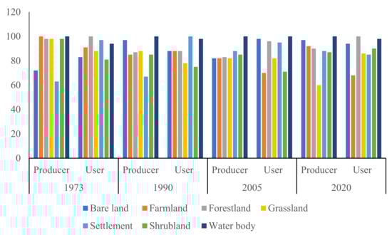 The overall accuracy for the base year (i.e., 1973) was 90%, 87% for 1990, 86% for 2005, and 88% for 2020. The Kappa coefficient for 1973 was 0.88, 0.85 for 1990, 0.84 for 2005, and 0.86 for 2020. Figure 2 summarized the producer’s and user’s accuracies for each LULC class across the four investigated years. The classification of waterbodies displayed a 100% producer accuracy across the four years, indicating that no pixel was incorrectly excluded from this land cover type (Figure 2). The classification of settlement displayed the lowest producer accuracy in 1973 and 1990, while grassland showed the lowest producer accuracy in 2020 (Figure 2). In summary, the kappa coefficient is rated as substantial and hence the classified image was found to be fit for further use and analysis.