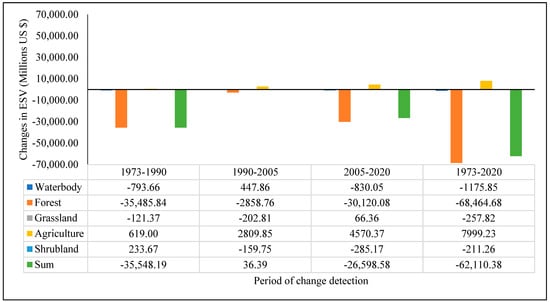 Table 8 summarizes the total ESVs of the identified LULC classes. We detected that only the ESVs of farmland increased between 1973 and 2020 (Table 8; Figure 4). The total ESVs were reduced from US $117,384.3 × 106 in 1973 to US $55,273.9 × 106 in 2020. It was found that the major contributor to this change is the change in forestland. The next major contributor to the reduction of total ESVs across the study periods was the reduction of waterbodies (Figure 4). It is also observed that the changes in LULC over a period of 47 years resulted in a total loss of ESVs of US $62,110.4 × 106 (Figure 4). Considering that the loss of waterbodies is one of the major contributors to the loss of ESVs, the reported values here might be underestimated, as the spatial resolution of the Landsat Maps used in this study could not capture the loss of small water bodies, such as springs, due to LULC changes. These changes in LULC and associated loss of ESVs are expected to increase in the near future if the current decreasing trends of forestland, shrubland and waterbodies continue. Many other studies e.g., [,,,,] have also shown similar results in that the loss of shrubland, grasslands and forestlands are major contributors to the reduction in ESVs. The expansion of bare lands in the basin could also contribute significantly to this.