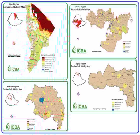Surface salinity classes (0–30 cm) of Afar, Amhara, Oromia, and Tigray regions of Ethiopia [5].