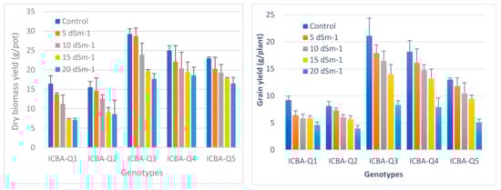 Dry biomass yield and grain yield of five quinoa genotypes as affected by different salinity levels [39].