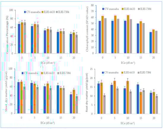 Influence of different salinity levels on germination percentage; chlorophyll content; shoot and root dry matter yield of three selected Rhodes grass species [42].