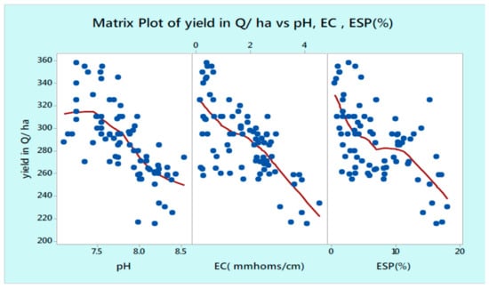 Matrix plot of onion crop yield vs. soil pH, total soluble salts (EC) and exchangeable sodium percentage (ESP) [41].