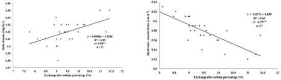 Relationship between ESP to soil bulk density, and hydraulic conductivity (** = highly significant correlation) [44].