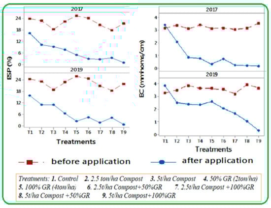 Changing of soil chemical properties status (ECe and ESP) from 2017–2019 after application of gypsum and compost [41].