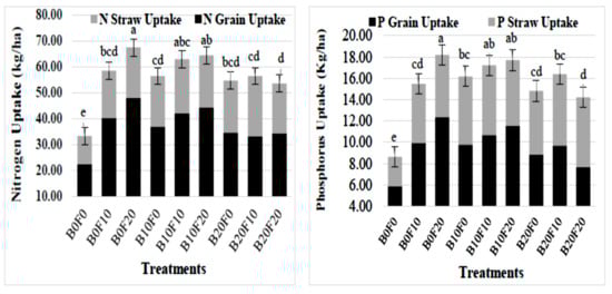 Influence of filter cake (F) and bagasse (B) on rice N and P uptake under calcareous sodic soils at Amibara [34].