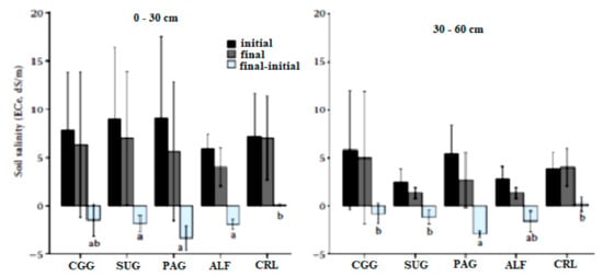 Soil ECe reduction through phytoremediation using different plants. CGG = Chloris gayana grass; SUG = Sudan-grass; PAG = Panicum antidotale grass; ALF = alfalfa legumes forage; CRL = control [40].