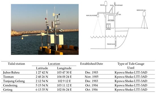 Figure 1. Schematic of a tide gauge measurement system and locations and details of stations based in Terengganu, along the East Coast of Peninsular Malaysia. Source: the pictures from https://www.sutron.com/product/tide-stations/, accessed on 1 December 2021, and https://www.unavco.org/instrumentation/geophysical/tide-gauges/tide-gauges.html, accessed on 1 December 2021.