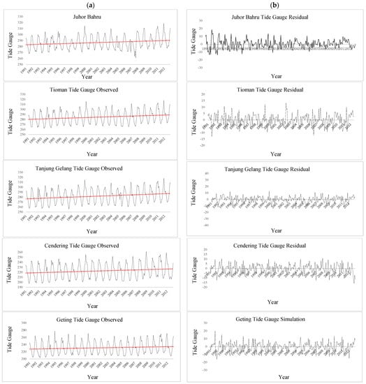 Figure 4. (a) Monthly tidal gauge data from five tide gauge stations between 1991 and (b) From 1991 to 2012, sea level residuals at five tide gauge stations along Peninsular Malaysia’s East Coast.