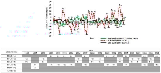 Figure 5. Sea-level residuals compared between the lowest and highest El Niño and La Niño year, 1985 to 2012, of Cendering station: +a High Sea Level Residual (HSLR); −a Low Sea Level Residual (LSLR); +b High Sea Level Pressure (HSLP); −b Low Sea Level Pressure (LSLP); +c High Sea Surface Temperature (HSST), and −c Low Sea Surface Temperature (HSST).