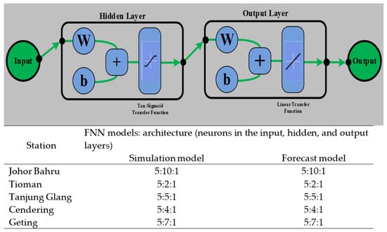 For the FNN Model, we applied three interconnected neural network layers consisting of an input layer, a hidden layer, and an output layer. The best FNN architecture was selected after 200 runs of simulation and prediction of each tide gauge station. Thus, there are five input nodes and one output node. In hidden and output layers, each input is multiplied by a corresponding weight. The sum of the product is then calculated and processed using a function: The standard activation function comprises a linear transfer function (purelin) and a non-linear tan-sigmoid transfer function (logsig, tansig). All neurons of a particular layer usually have similar activation functions [63]. Figure 7 presents the architectures of all developed FNN model.