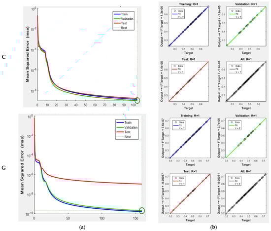 In Figure 8a, the blue, green, and red lines show the training, validation, and testing sets, respectively. The dotted line indicates the best performance under a minimum error. Based on the result, the best validation performance occurs at epoch 117. While due to some outliers, the FNN model at Cendering station yielded R: 1 and MSE: 1.366; the scatter plot indicates that the calculation and performance of the model are significant. The high degree of agreement between the amount observed and the simulated data from the model FNN is shown in Figure 8. This presents the plot of the sea level at Cendering and Geting stations, which is visible from R:1 and MSE:1.366 and R:1 and MSE:1.032, respectively. Figure 8b demonstrates high accuracy for the estimate by the Geting Station FNN model for which R: 1 and MSE: 1.032 were obtained. The plot of the sea level yielded by the FNN model at Cendering station (Figure 8) indicates appropriate levels of validity precision (R: 1 and MSE = 1.366). The RMSE, MAE, and SSE suggest appropriate levels of validity precision for estimates at all stations based on the FNN model. Table 2, as well as Figure 8, summarise these parameters for the FNN model. Notably, estimates at Chendering and Geting stations are superior to those obtained for the Tioman, Tanjung Gelang, and Johor Bahru stations.