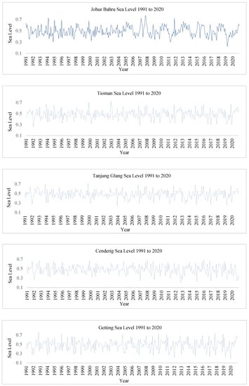 Because it is part of Peninsular Malaysia’s East Coast Economic Region (ECER), which includes four states: Kelantan, Terengganu, and Pahang, as well as the district of Mersing in northeast Johor, five tidal gauge stations, were chosen as a study area [53] (Figure 2). The first tidal gauge station (Johor Bahru) is located between the latitudes of 01°27.7″ N and the longitudes of 103°47.5″ E in the Jeti Kastam Johor Bahru. The Tidal Station’s Zero of Tide Gauge is 6.079 m below survey department brass BM J0416 or 2.657 m below DTGSM. Johor Bahru is a city in Malaysia. The value of 7.034 m was achieved in May of 1998. The second tidal gauge station (Pulau Tioman) is located between the latitudes of 02°48.4″ N and the longitudes of 104°08.4″ E in the Jeti Berjaya Kuantan. The established value for Pulau Tioman is 7.930 m, and it was established in May of 1998. At Tidal Station, the zero of the tide gauge is 6.586 m below survey department brass BM C0501. Monsoon winds and tides, in essence, are essential natural factors that help shape the Kuantan Coastline. Due to its location as an active tourism gateway to the East Coast Economic Region, Pulau Tioman station was chosen as the fourth tidal gauge station. There are various unique tourism attractions, particularly in the fields of mainland coastal and sustainable island tourism, ecotourism, urban tourism, and the country’s traditional culture and heritage tourism. The third tidal gauge station (Tanjung Gelang) is situated between 03°58.5″ N and 103°11.2″ E in Pelabuhan Kuantan. At the tidal station, the zero of the tide gauge is 6.496 m below survey department brass BM C0331 or 2.661 m below DTGSM. The Tanjung Gelang date of establishment is April 1998, and the established value is 7.731 m. The fourth tide gauge station (Cendering) is located in the eastern part of Terengganu, near the coastal city of Kuala Terengganu, which is also the state capital and has a population of 286,317 people. It is located between latitudes of 05°15.9″ N and longitudes of 103°11.2″ E. Tidal Station’s zero is 4.688 m below survey department brass BM T0283 or 2.084 m below DTGSM, and is located on the left corner of the T-junction facing Tidal Station. The Cendering established value is 6.732 m, and the date of establishment is April 1998. With semi-diurnal tides and an average yearly temperature of 25 °C to 27 °C, the northeast monsoon dominates the coast in this area. The fourth tide gauge station (Getting) is located in Kelantan’s north, near Kompleks LKIM, between latitudes of 06°13.06″ N and longitudes of 102°06.4″ E, with an established value of 7.230 m and data from April 1998. At Tidal Station, the zero of the tide gauge is 5.964 m below survey department brass BM D0354 or 2.112 m below DTGSM. In Pahang, Johor, Kelantan, Kedah, and Terengganu, severe weather phenomena such as floods, storms, droughts, and climate patterns have occurred. These occurrences show that Malaysia is vulnerable to climate change.