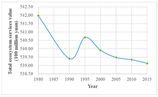 The total ecosystem service value in the Poverty Belt around Beijing and Tianjin from 1980 to 2015 (unit: CNY 100 million).