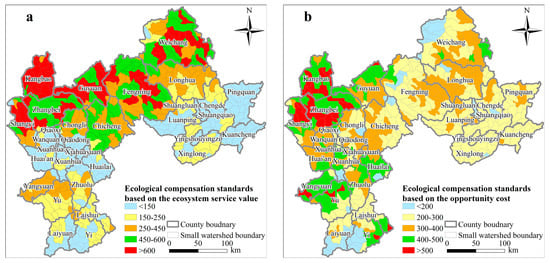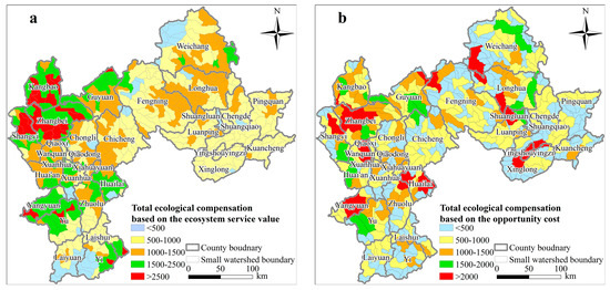 The total ecological compensation value based on the (a) ecosystem service value and (b) opportunity cost on the small watershed scale in the study area (unit: CNY 10,000).