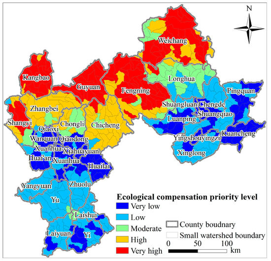 Ecological compensation priority levels in the Poverty Belt around Beijing and Tianjin.