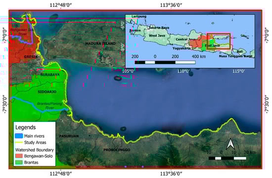 The study took place in the eastern coastal region of East Java Province, Indonesia, between 112.45 to 114.21º E and 6.833 to 7.93º S (Figure 1). East Java Province was chosen as the study area because of the presence of Surabaya, a coastal megacity, and the industrial development of the coastal regions. This is compounded by the degradation of the watersheds of the main rivers in East Java (i.e., Brantas/Porong and Bengawan Solo), which has increased organic sediment load [39] and domestic plastic pollution [40,41] due to improper waste management, both of which affect the marine environment [42].
