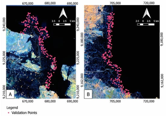 This algorithm is rarely used for the classification of remote sensing data [55], especially for multi-class classification. However, it is a well-known method in studies of species distributions and habitat models [53,56,57], and it has been reported to perform better in one-class or binary classification applications than other algorithms, such as the support vector machine method [58]. The GMO-Maxent method was compared with the random forest (RF) method [59] in classifying land, suspended sediment, and seawater body classes. To assess the accuracy of both methods, we randomly distributed 500 points, both on land and non-land bodies, along 1 km of the detected shoreline and constructed a confusion matrix to calculate the producer’s accuracy (PA), user’s accuracy (UA), and overall accuracy (OA) (Figure 2).