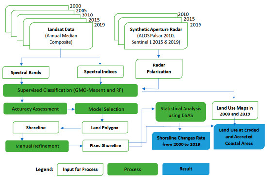 This study used Landsat surface reflectance data with a 30 m spatial resolution as the main datasets, which were accessed and processed in the GEE for the years 2000, 2005, 2010, 2015, and 2019 by taking the median reflectance values within each year. Depending on availability, some years (i.e., 2010, 2015, and 2019) included SAR data from ALOS Palsar/Global Palsar (horizontal–horizontal, HH, and horizontal–vertical, HV, polarizations at a 25 m spatial resolution) and Sentinel-1 C-band data (vertical–vertical, VV, and vertical–horizontal, VH, polarizations at a 10 m spatial resolution) to complement the Landsat surface reflectance (SR) data in the GEE. All radar data were resampled to a 30 m spatial resolution to match the resolution of the Landsat data. The combination of SAR backscatter and spectral bands from optical data is thought to increase the accuracy of land-use and land-cover classification, as reported in studies on classifying land cover in Southeast Asia [43], identifying flooded wetland areas [44], and enhancing the accuracy of shoreline mapping [45].