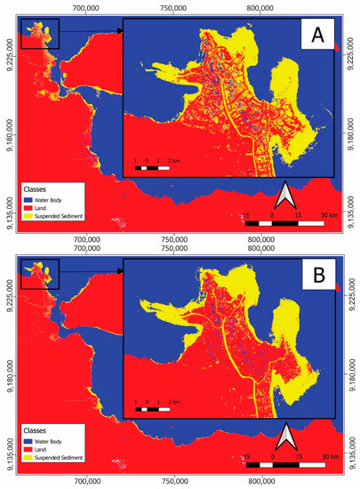 Classification of land and water bodies (seawater in blue, turbid water in yellow) in the year 2000 by (A) RF with 80 trees (OA: 84%) and (B) GMO-Maxent (OA: 93.6%), revealing the misclassification of land areas as turbid water (inset).