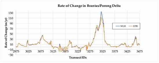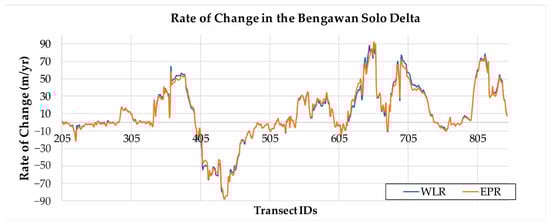 End point rate (EPR) and weighted linear regression rate (WLR) statistics from the transect lines, revealing major regions of shoreline changes along the shoreline of East Java.