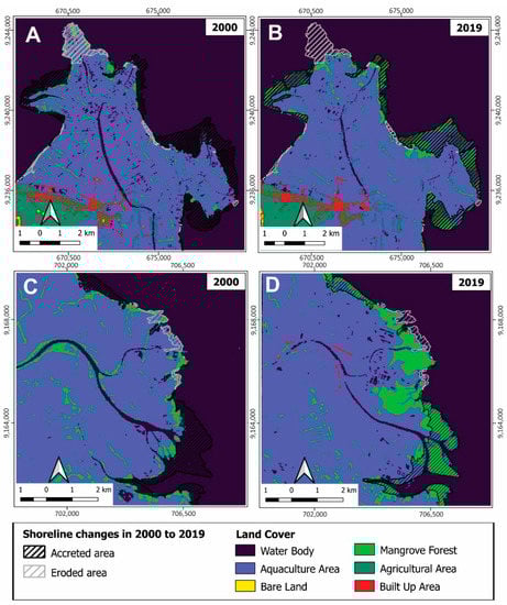 Land-use composition and shoreline changes from 2000 to 2019 in the Bengawan Solo river in (A) 2000 and (B) 2019 and in the Brantas/Porong river in (C) 2000 and (D) 2019.