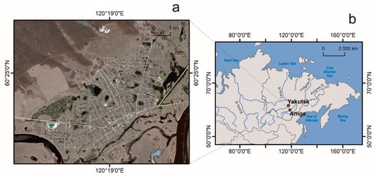 The study area is located in the southeastern part of Central Yakutia, on the left bank of the Amga River (Figure 1). Geomorphologically, the study area is situated in the Prilenskoye Plateau on the above floodplain terrace of the left bank with a height of 149–213 m. It is composed of a loamy-sandy loam stratum with a large ice-wedge ice up to 15–20 m thick. The climate of the study area is sharply continental. The average annual air temperature for the “Amga” Meteorological Station is 8.3 °C. Average January values reach −40.8 °C, and in July, they reach +17.6 °C. The annual precipitation in the region averages 270 mm [].