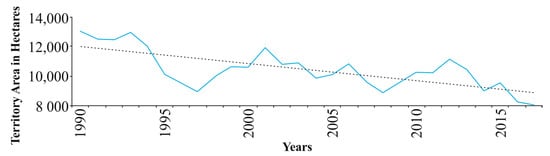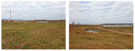 After the collapse of the Soviet Union and the socio-economic crisis in Russia, large state collective farms were liquidated, and they were replaced by significantly smaller enterprises, representing both state and private forms of ownership []. At the same time, there was significant sequestration of the area of cultivated land. The graph below (Figure 2) refers to the entire Amga District; however, it can also represent the district center itself. The territories of the formerly arable lands either remained abandoned or used for construction.