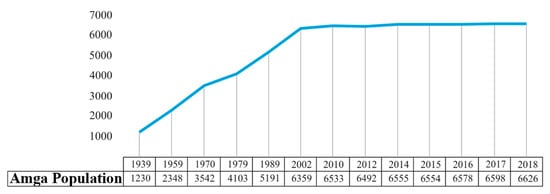 Another indicator that needs to be addressed is the dynamics of the Amga population. In the Soviet period, in this respect, it was also characterized by a significant increase. In Amga, in 1939, there were 1230 people, and in 1989, there were 5191 people. The population of Amga, with rare exceptions, increased annually in the post-Soviet period as well (Figure 3) because the village, as noted, is the regional center of the Amginsky Ulus. The population of Amga in 2018 was 6626 people, of which more than 90% were Sakha (Yakuts). The top place in the economy is agriculture: meat and dairy cattle breeding, cattle and horse breeding, growing crops—vegetables, grain, and fodder.
