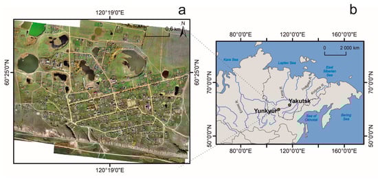 In September 2019, we carried out landscape–geomorphological observations and created an orthomosaic of the village of Yunkyur. We obtained aerial photographs of the area using the DJMavic 2 Pro UAV, which has a 20-megapixel digital camera and captures coordinates. Unmanned aerial vehicle flights took place in an autonomous mode using special software. We made these observations at an altitude of 200 m above the earth’s surface, making it possible to achieve a 70% overlap of the images. We have taken a total of 1325 images. For more accurate georeferencing of orthomosaics, we created a network of control points made for each site, the coordinates of which were measured using a geodetic GNSS receiver (Trimble 5700) static mode. In total, we laid ten reference marks for each site with a reference accuracy of less than 3 cm. The obtained aerial photographs were processed using the AgisoftPhotoScan software based on the reference network. As a result, we received an orthomosaic with a planned resolution of 1.5 cm/pixel, which covered an area of 1.2 km2. We carried out further processing of the created orthomosaic in the ArcMap 10.1 software environment. To map the Amga Village, we used the ArcGis Online service (ESRI). High-resolution satellite images from the Spot image company and some Digital Globe Company products are available []. The resolution of space images was 50 cm/pixel. Interpretation was performed in manual mode, and statistical indicators were calculated automatically using internal software modules.