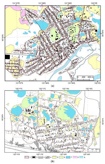 Schematic map of the development of thermokarst processes on the territory of the village. Amga (a) and Yunkyur (b). Legend: 1—outlines of residential quarters, 2—buildings and structures, 3—dirt roads, 4—ravines, 5—territories with the development of bylars, 6—Holocene alas basins, 7—thermokarst lakes, 8—larch forest, 9—old lakes.