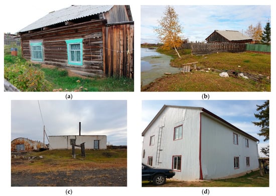 The preliminary dumping of the territory before the construction of any buildings should be considered more broadly—in general, as a change in the construction technology customary for rural communities in the republic due to the activation of thermokarst processes. This is also evidenced by the construction of wooden houses on a pile foundation (Figure 14)